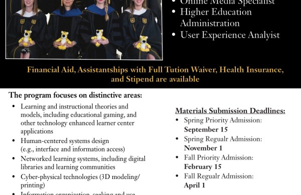 The iSchool at the University of Missouri welcomes applications for Spring 2017 for admission to its interdisciplinary doctoral program housed in the School of Information Science & Learning Technologies (SISLT). Deadlines for fall semester: Priority admission: September 15 Regular admission: November 1 iSchool faculty are committed to collaborative, interdisciplinary approaches to their work, both within MU and among other research-extensive universities. Areas of focus include, but are not limited to: Advanced study of contemporary learning and instructional theories; Human institutions, including libraries and archives, that support information access and cultural preservation; Human-centered systems design… Read more PhD Program – Apply now! →